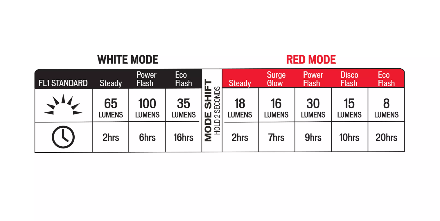 Режим Steady Low: 18 люмен в течение 9:00 часов